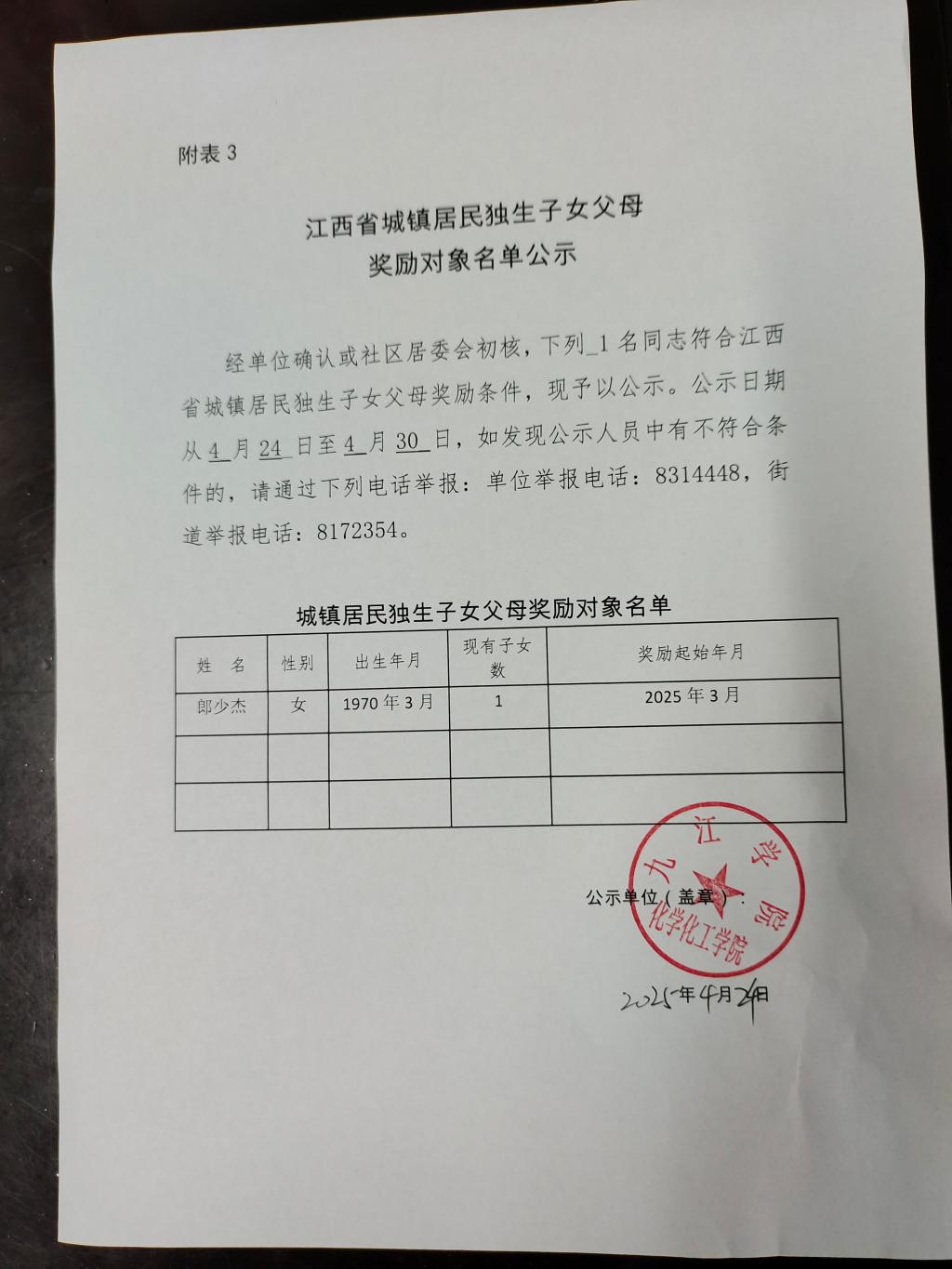 关于符合江西省城镇居民独生子女父母奖励对象名单的公示2025(郎少杰)