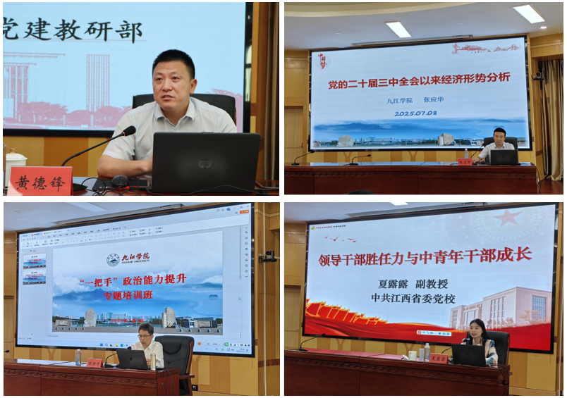 培训班课程紧扣深入贯彻中央八项规定精神学习教育和干部能力提升,既有理论学习,又有形势分析,既注重方法讲授,又注重研讨交流,做到了理论与实践相结合、务虚与务实相统一。培训班开展了4场专题辅导,邀请了省委党校党史党建教研部主任黄德锋教授作《习近平总书记关于树牢正确权力观、政绩观、事业观论述》辅导报告,省委党校国家治理教研部夏露露副教授作《领导干部胜任力与中青年干部成长》辅导报告,九江学院马克思主义学院院长陈胜才教授作《持续擦亮新时代党的建设“金色名片”》辅导报告,九江学院经济学院张应华副教授作《党的二十届三中全会以来全国经济形势分析》辅导报告。组织学员观看了警示教育片《镜鉴家风》,并以“结合工作实际谈如何贯彻中央八项规定精神,推进作风建设常态化、长效化”为主题,开展了1次分组交流研讨。