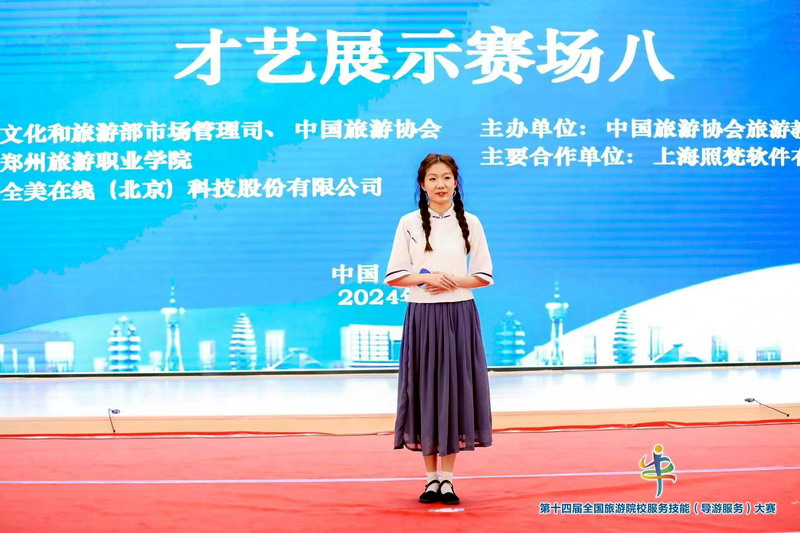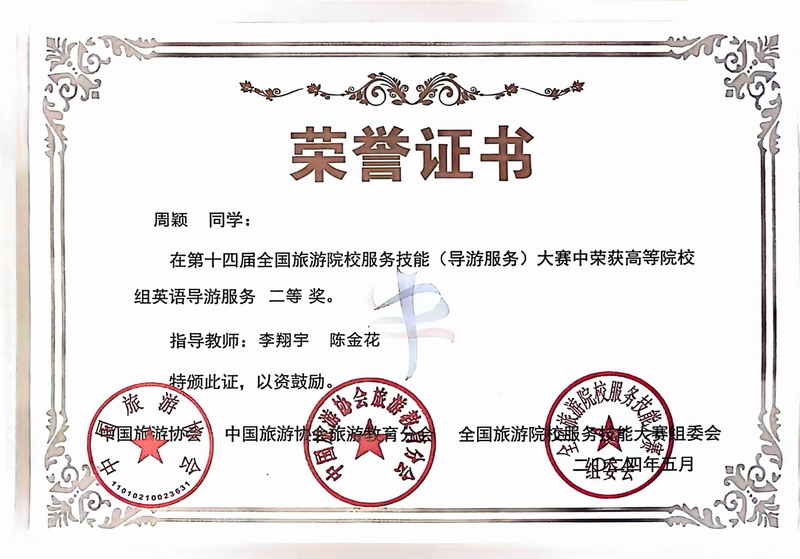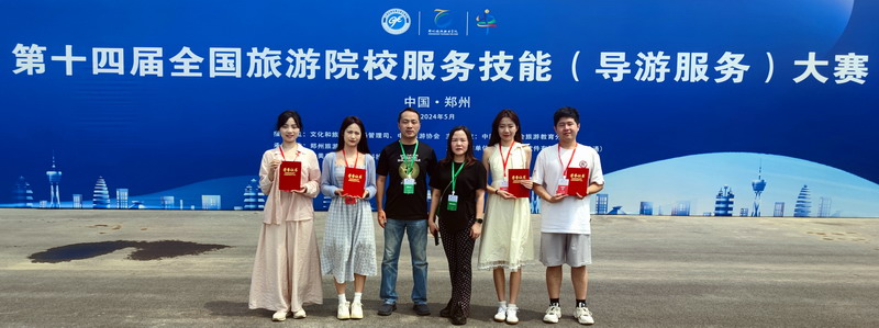 2024年5月23日至26日,第十四届全国旅游院校服务技能(导游服务)大赛在河南郑州举行,旅游与地理学院选派了周颖、余乐琪、张一博、孙雪瑞4名学生分别参加了英语导游服务和普通话导游服务项目。经历激烈角逐,2022级旅游管理专业学生周颖、余乐琪分别夺得英文组赛项二等奖;2021级旅游管理专业学生张一博,2022级旅游管理专业学生孙雪瑞分别夺得普通话组赛项三等奖。