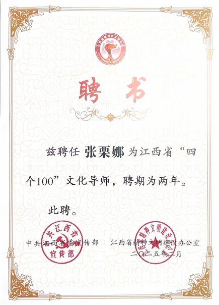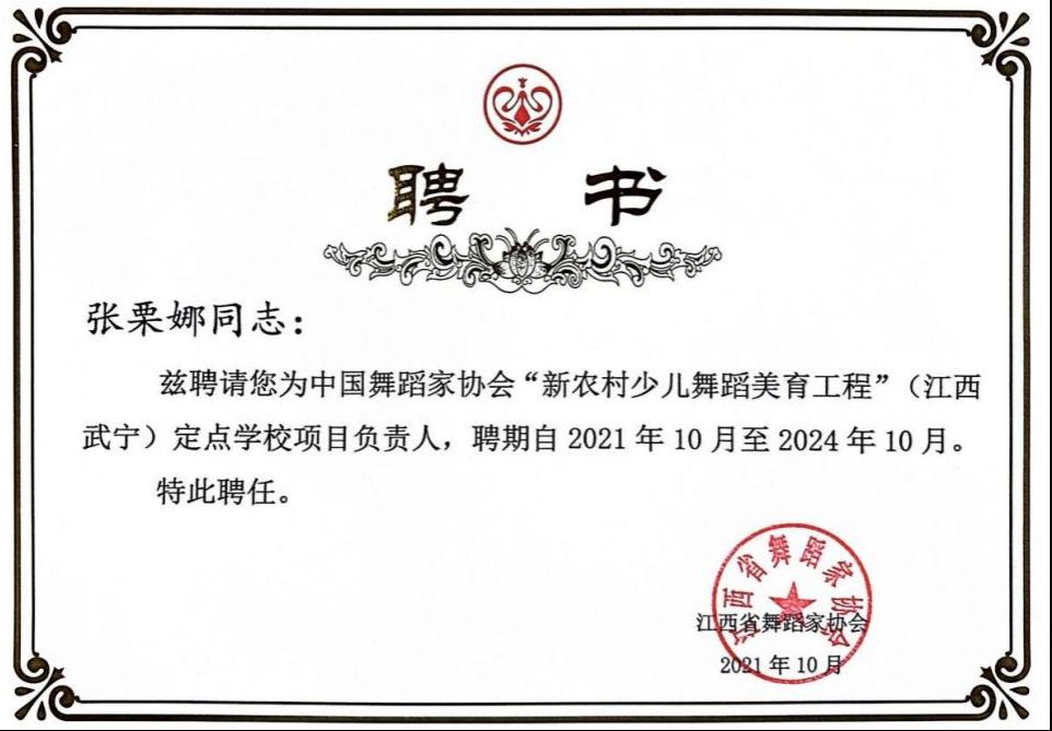 张栗娜被聘为“新农村少儿舞蹈美育工程”(江西武宁)定点学校项目负责人