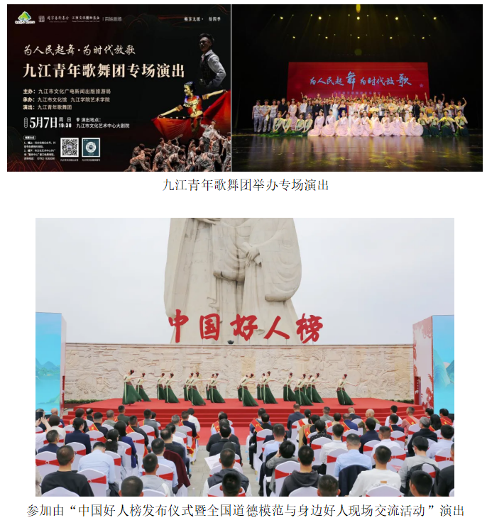 九江青年歌舞团成员由九江学院艺术学院音乐舞蹈专业师生构成,该团师生不仅是表演者,还是创作者,更是教育者。他们通过舞台实践充分了解舞台创作规律和理论与实践知识,再反哺教学对象。所以,该团自成立以来的原创作品已成为本专业《剧目排练》《舞蹈作品赏析》《编舞技法》《小型歌舞剧》等多门课程的实践案例。