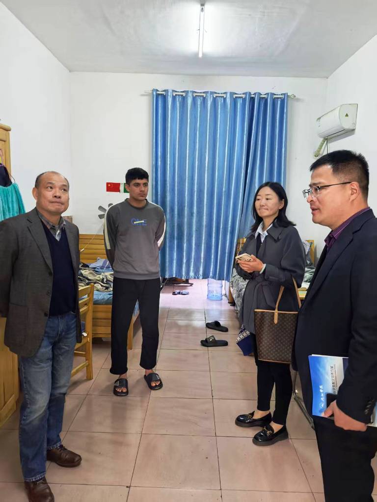 随后,他还走访视察了24栋学生宿舍,和部分学生作了交流。他鼓励学生们多多加强中文交流,保持宿舍整洁并经常性地开窗通风。