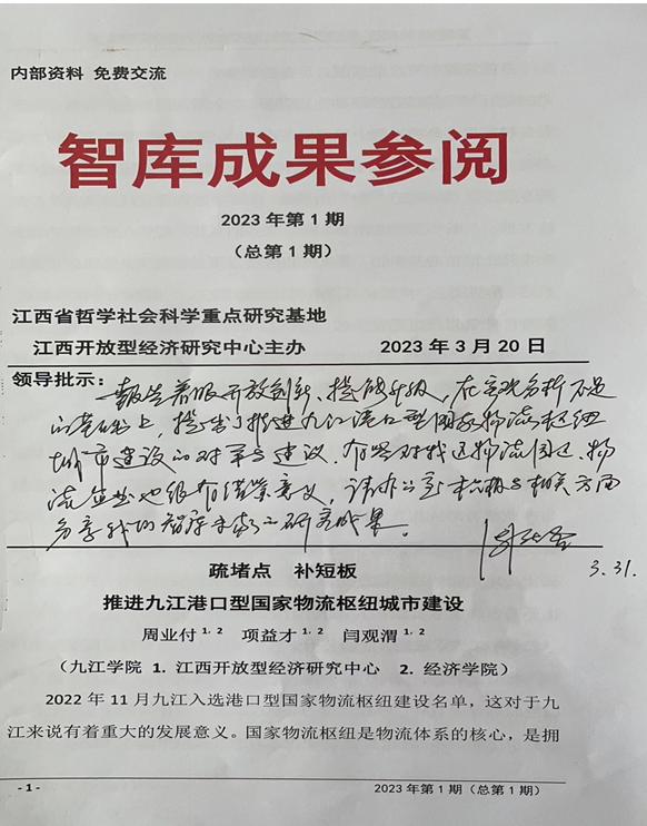 由江西开放型经济研究中心主办《智库成果参阅》出版的第1期智库成果《疏赌点 补短板 推进九江港口型国家物流枢纽城市建设》 (作者:周业付;项益才;闫观渭)受到九江市浔阳区政协主席周庆吾肯定性批示,批示指出:报告着眼开放创新、提能升级,在客观分析不足的基础上,提出了推进九江港口型国家物流枢纽城市建设的对策与建议,有些对我区物流园区、物流企业也很有借鉴意义。请办公室积极与相关方面分享我们智库专家的研究成果。