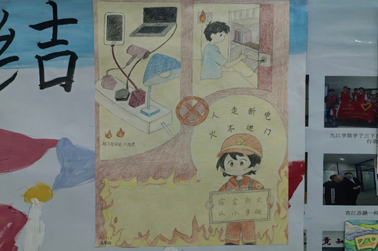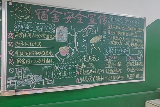 12月上旬,计算机与大数据科学学院通过班级群等渠道发布活动通知,开展“‘电’亮安全灯,宿舍‘零’隐患”主题海报与黑板报活动。同学们参与热情,分组协作、集思广益,将工科生的理性思维与艺术创意相结合:有的作品通过直观的数据呈现宿舍违规用电的风险概率,筑牢安全隐患的数字思想防线;有的则通过卡通漫画还原“私拉乱接电线”“使用大功率电器”等典型违规场景,搭配趣味标语传递安全理念。这种以同学们喜闻乐见的创意形式,发挥了工科学生的专业优势与创新思维,让安全用电、杜绝隐患的理念深入人心。