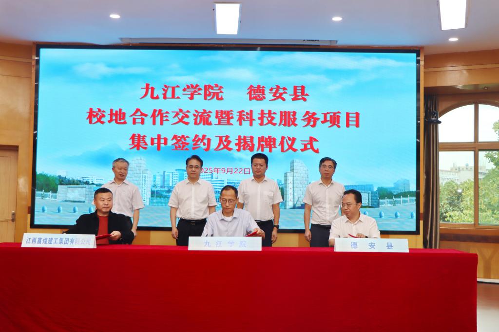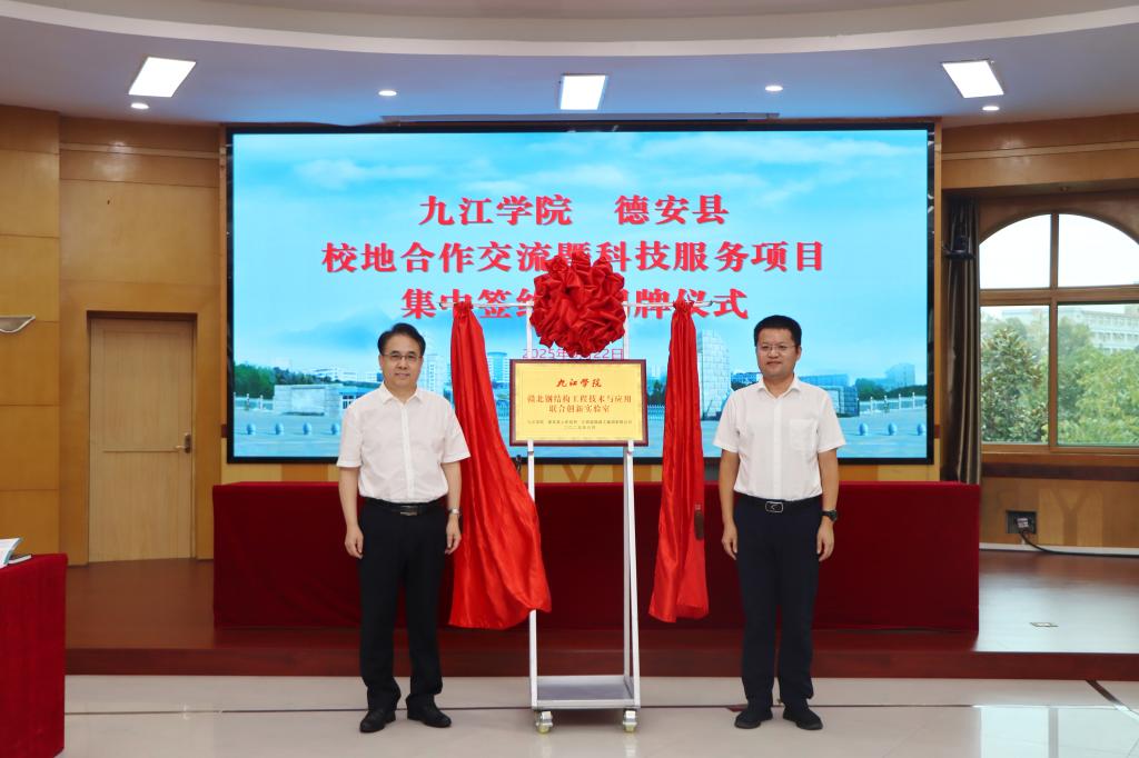 9月22日,九江学院与德安县科技合作项目集中签约仪式在学校举行。九江学院党委书记李明斌、德安县委书记艾菲出席仪式,并共同为九江学院赣北钢结构工程技术与应用联合创新实验室揭牌。九江学院党委委员、副校长王殿元,德安县委常委、组织部部长、统战部部长许巨峰,德安县政府副县长郑鹏出席仪式。九江学院党委委员、副校长鲁卫东主持仪式。