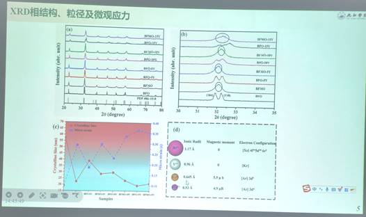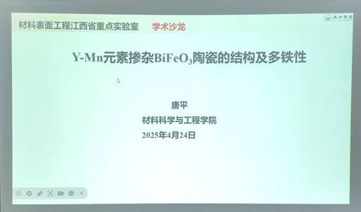 唐平博士以“钇锰掺杂铁酸铋陶瓷的磁电多铁性质为主题分了近期研究及发表的工作内容。重点介绍了通过调控极化方向与大小实现铁磁性物质的设计与制备。