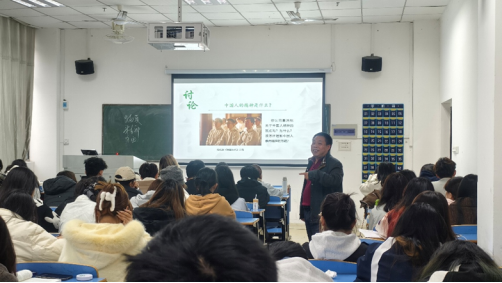 在核心内容讲授环节,曹博士围绕中国精神的本质展开系统阐释。他指出,中国精神是民族性与时代性的有机统一,既是中华民族在长期实践中形成的价值取向、精神气质的总和,也是顺应时代潮流不断发展的思想观念与社会风尚。在解读民族精神时,曹老师结合大禹治水、精卫填海等神话传说,生动诠释了伟大创造、伟大奋斗、伟大团结、伟大梦想精神的丰富内涵;引用马克思对中国古代四大发明的高度评价与李约瑟的学术论断,让同学们深刻体会到中华民族与生俱来的创造活力。谈及时代性特征时,他以抗美援朝战争中"钢少气多"的制胜密码、新时代经济快速发展与社会长期稳定的两大奇迹为例,阐明精神力量如何转化为物质力量,如何弥补物质条件的不足,让同学们不仅深刻理解了民族精神与时代精神的内在关联,而且直观感受到中国精神与时俱进的鲜活生命力。