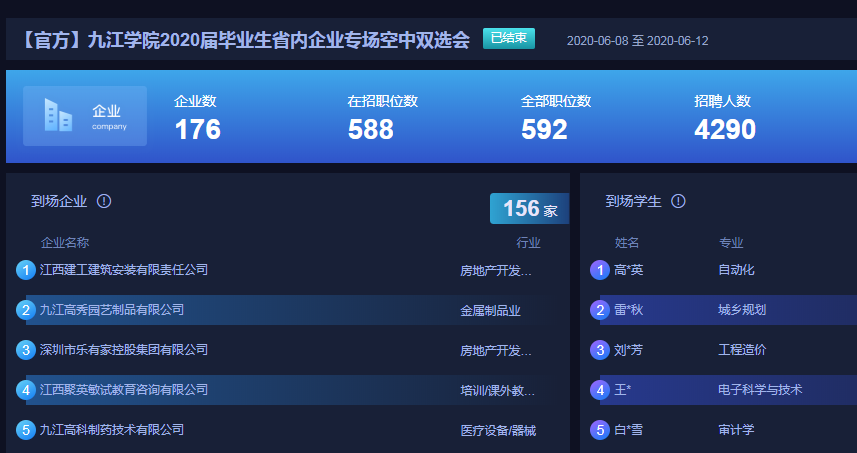 为满足用人单位对人才的渴求,缓解2020届毕业生就业的迫切需求,搭建用人单位与毕业生双向选择的服务平台,2月26日,学校依托云就业平台成功举办了2020年春季网络视频双选会,本次双选会共计300家企业参加,提供了1137个岗位;6月8日至12日组织省内企业专场“空中”双选周,邀请省内企业170余家,招聘需求达4244人。学校搭建的网络招聘平台成为毕业生求职的“及时雨”,解决了疫情期间毕业生就业渠道不通畅的问题。