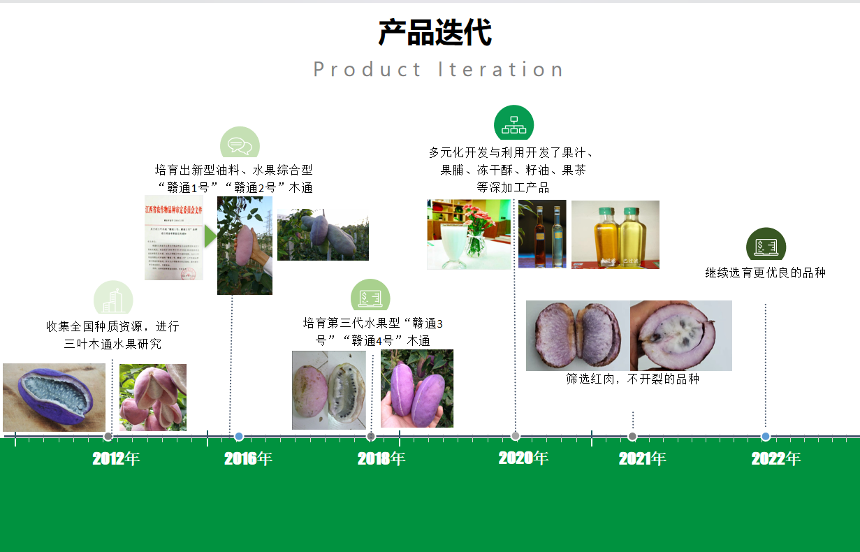 公司推出的主要产品是三叶木通水果、木通苗木、中药材预知子。后期的深加工系列产品有木通籽油,木通果汁,果茶,果脯,冻干酥。