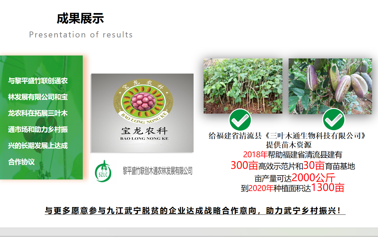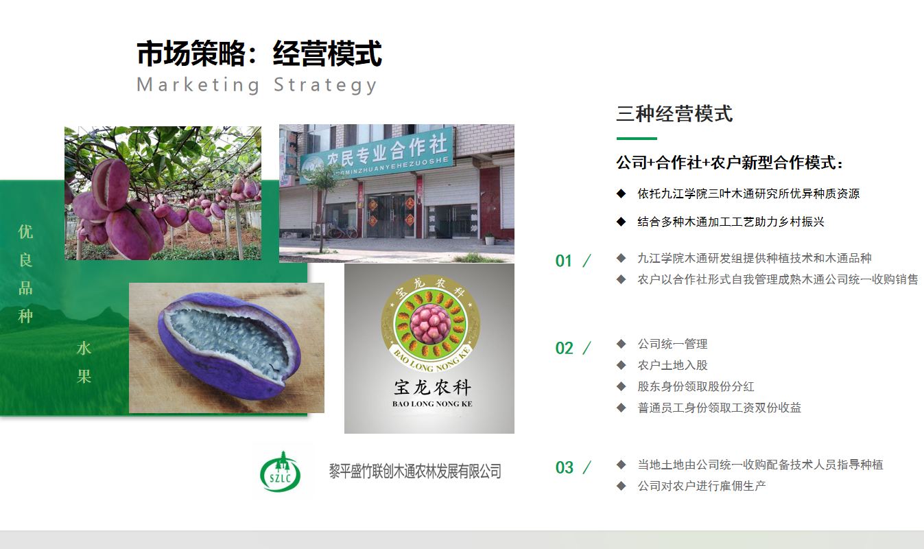 九江市武宁县,国家领导人曾到此视 察过脱贫情况,现已全面完成脱贫攻坚任务,其基础建设也获得长足发展。武宁县气候温和湿润,地处丘陵山地,耕地面积少,林地面积大,农业发展受限。本项目依托九江学院三叶木通研究所,充分利用武宁县大量抛荒的丘陵山地,初期着眼于优质三叶木通品种种植和销售,以第三代水果的需求日益增加为市场痛点,推出三叶木通水果及籽油,预知子系列产品,并根据武宁当地政治、教育、经济、农业现状进行定点帮扶。