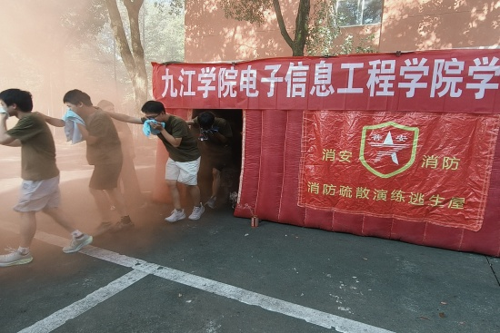 宣讲环节在竞知楼阶七教室进行,消防宣讲员结合高校火灾案例,讲解宿舍用电用火规范、隐患排查及初起火灾扑救等方法,强调“冷静、弯腰、低姿、捂口鼻”等逃生要点,并现场演示灭火器的使用。随后,在学生公寓15栋西侧空地上进行,实战演练包括“黑暗逃生体验屋”(模拟烟雾、曲折通道)。新生严格遵循要领有序撤离,全员按时完成。