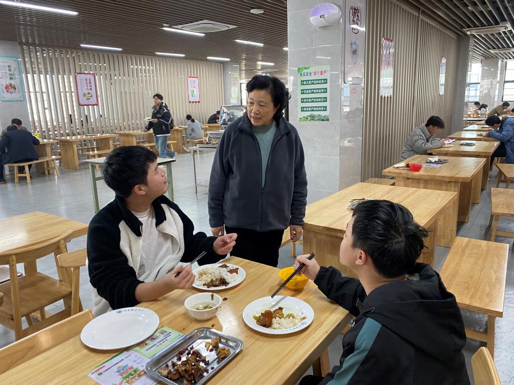 随后,吴桃娥主任走到就餐同学当中,与学生亲切交流,了解到学生对饭菜质量与价格表示满意,对学期末时段推出的暖心惠补举措尤为认可,认为这体现了学校对学生的真切关爱。