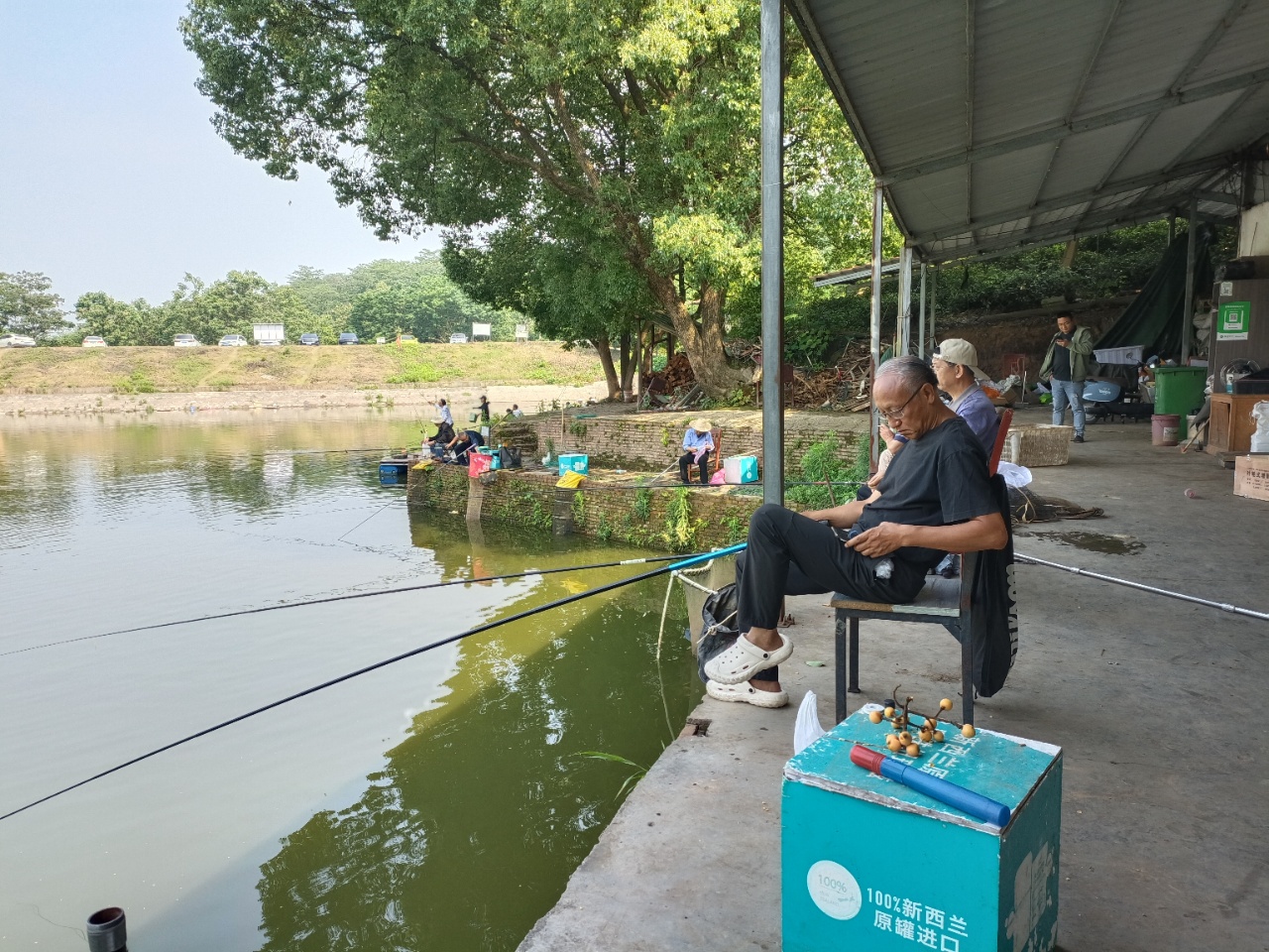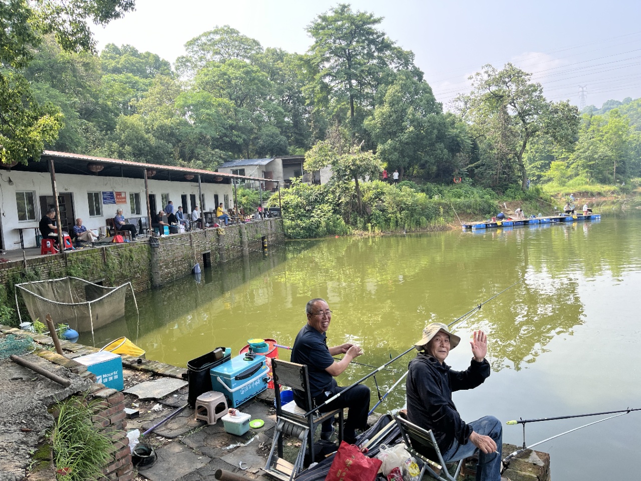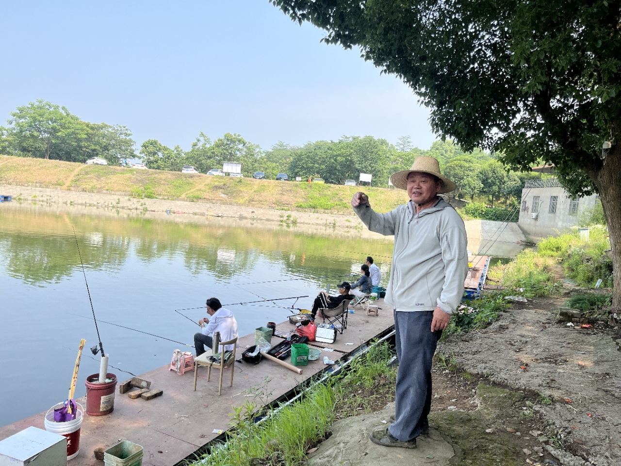 水面波光粼粼,岸边绿树成荫,退休老教师们专注钓鱼的身影,构成了一幅悠然自得的美好画面。