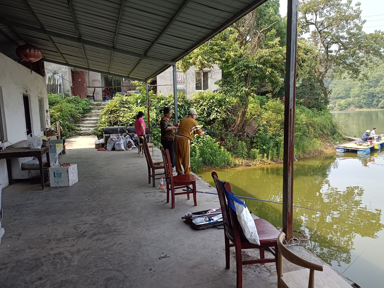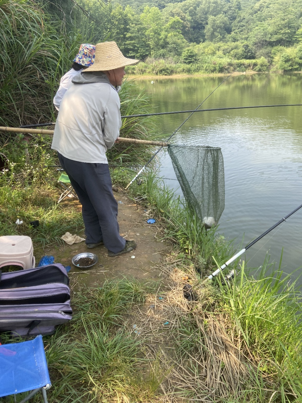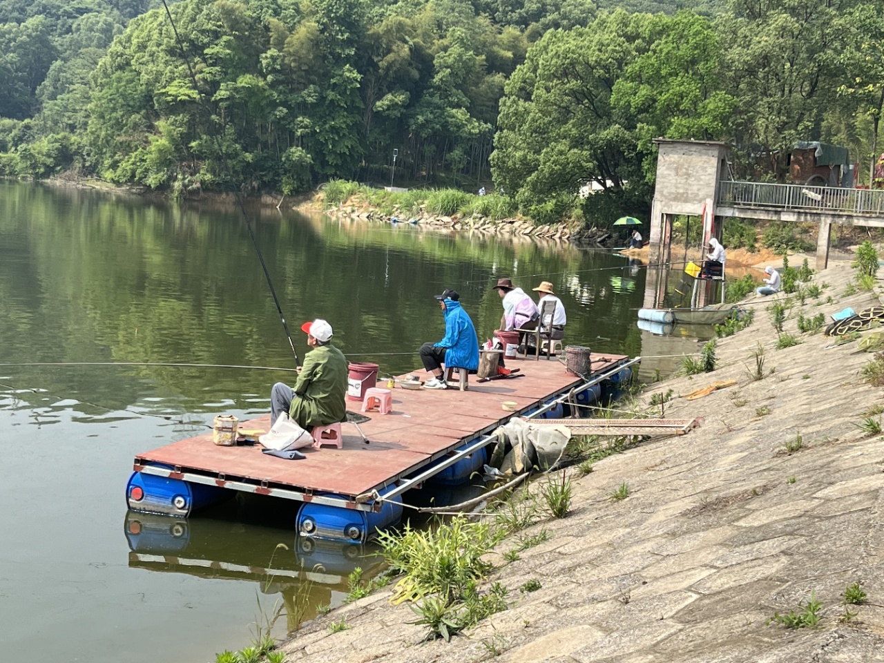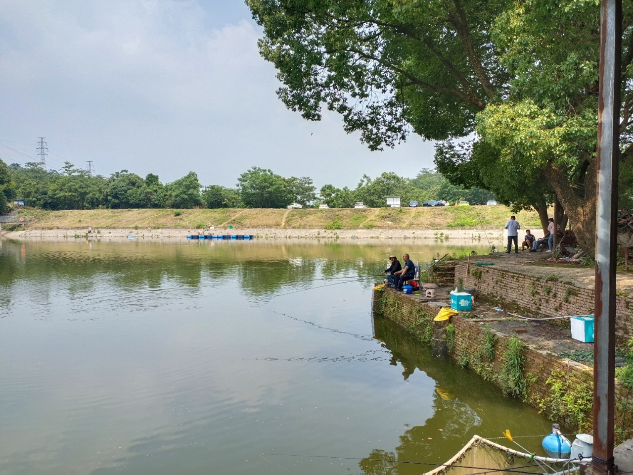 水面波光粼粼,岸边绿树成荫,退休老教师们专注钓鱼的身影,构成了一幅悠然自得的美好画面。